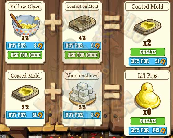 Each Lil Pip requires 6 Yellow Glazw, 6 Confection Molds (both requested) and 5 Marshmallows (Marshmallows/Sugar Cane)